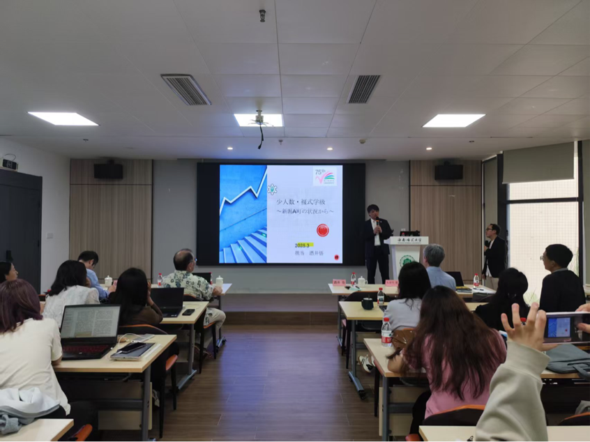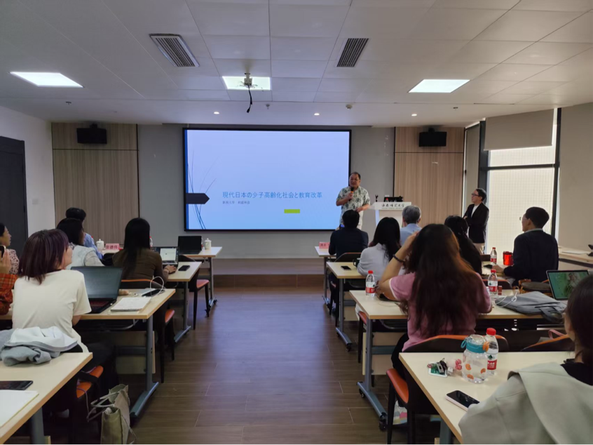 相庭和彥教授作了題為《現(xiàn)代日本少子老齡化社會(huì)與教育改革》的講座,系統(tǒng)解析了日本人口問題的演進(jìn)軌跡。基于厚生勞動(dòng)省最新人口普查數(shù)據(jù),相庭教授量化呈現(xiàn)了日本總生育率持續(xù)走低、老年撫養(yǎng)比突破60%等現(xiàn)實(shí)困境,著重闡釋《少子化社會(huì)對(duì)策基本法》等政策法規(guī)的制定邏輯及實(shí)施路徑,并對(duì)日本政府采取的一系列措施進(jìn)行詳細(xì)講解。他還分析了少子老齡化對(duì)教育、經(jīng)濟(jì)、醫(yī)療和家庭結(jié)構(gòu)等產(chǎn)生的深遠(yuǎn)影響,提出了創(chuàng)新社會(huì)支持系統(tǒng)的構(gòu)想,以期為中國(guó)日益嚴(yán)峻的人口問題提供參考。