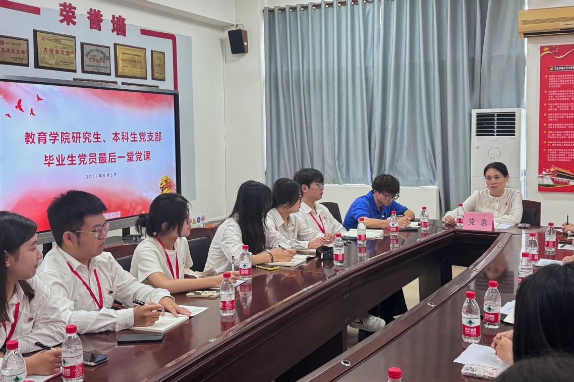 2025年6月5日上午10時(shí),在2025屆畢業(yè)生即將踏上新征程之際,教育學(xué)院于文學(xué)樓405黨員之家開展了2025屆畢業(yè)生黨員“最后一堂黨課”主題教育活動(dòng)暨歡送座談會(huì)。本次活動(dòng)由本科生黨支部書記黃宏丞主持,研究生黨支部書記王飛及來自研究生黨支部、本科生共26名畢業(yè)生黨員共同參加。