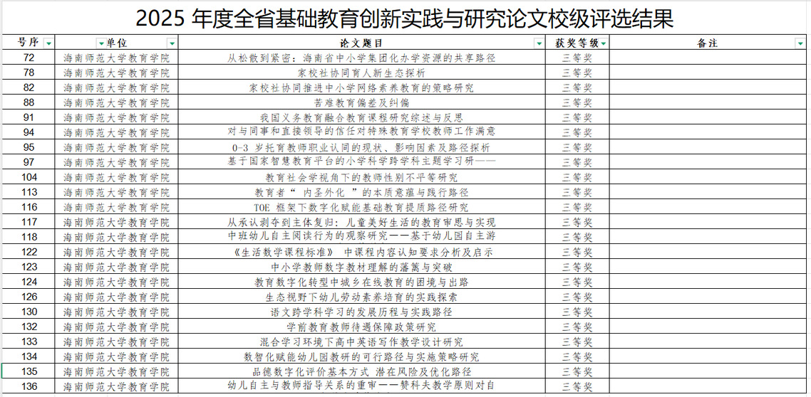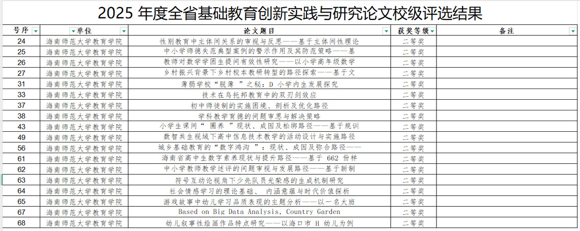 近日,2025年度全省基礎(chǔ)教育創(chuàng)新實踐與研究論文校級評選結(jié)果揭曉,我院師生表現(xiàn)優(yōu)異,共46篇論文獲獎,其中一等獎5名、二等獎18名、三等獎23名。此次評選充分展現(xiàn)了我院師生在基礎(chǔ)教育領(lǐng)域的創(chuàng)新能力和科研水平。教育學(xué)院將繼續(xù)鼓勵師生深耕教學(xué)研究,推動教育實踐創(chuàng)新,為基礎(chǔ)教育高質(zhì)量發(fā)展貢獻(xiàn)力量。