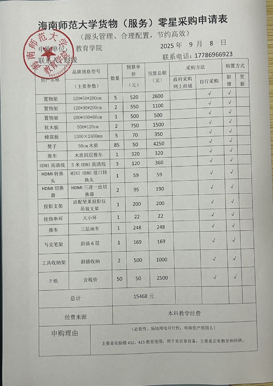 海南師范大學(xué)教育學(xué)院申請采購以下設(shè)備,根據(jù)學(xué)校相關(guān)規(guī)定,對購置物品進行公示如下,公示時間為9月29日-10月1日,如有異議請撥打電話:65889325。