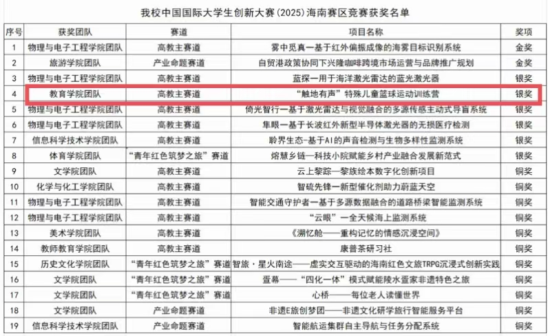 10月30日,中國國際大學生創(chuàng)新大賽 (2025) 海南賽區(qū)競賽頒獎典禮在海南大學舉行。熱烈祝賀教育學院戴慧群老師指導的“‘觸地有聲’特殊兒童籃球運動訓練營”榮獲2025屆中國國際大學生創(chuàng)新比賽海南區(qū)銀獎。