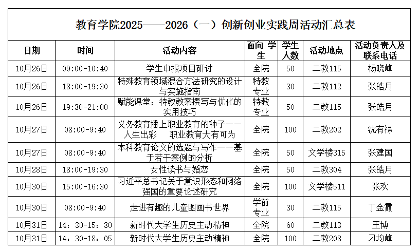 為激發(fā)學(xué)生創(chuàng)新思維、提升專業(yè)實(shí)踐能力,教育學(xué)院于2025年10月26日至11月1日開(kāi)展創(chuàng)新創(chuàng)業(yè)實(shí)踐周活動(dòng)。圍繞“專業(yè)賦能+創(chuàng)新實(shí)踐”主題,面向全院學(xué)生開(kāi)展9場(chǎng)講座活動(dòng),參與人次達(dá)到將近700人,涵蓋了教育學(xué)、特殊教育、學(xué)前教育、教育技術(shù)學(xué)等多個(gè)專業(yè)。